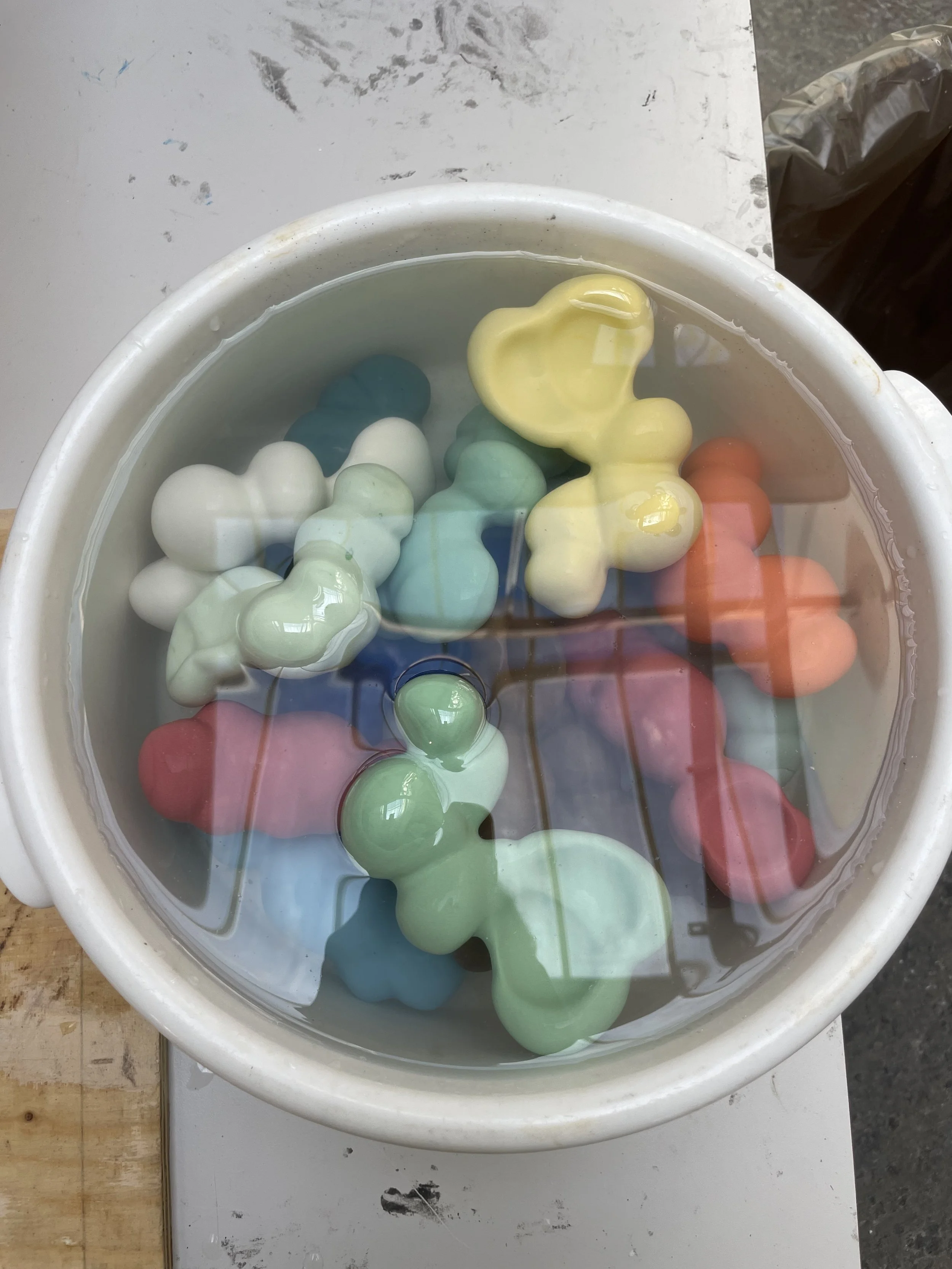 To achieve consistent colors, I decided after some tests, to color the porcelain slip with stains and use a glossy transparent glaze.